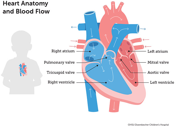 To understand the types of AHD, we first need to understand how the heart works. The heart is divided into four chambers, two on the right and two on the left. Each pair consists of an atria and a ventricle. Blood flows through these four chambers separately, meaning it does not mix between the chambers. The right side of the heart moves blood to the lungs through the lung (pulmonary) arteries. In the lungs, blood picks up oxygen then returns to the heart’s left side through the pulmonary veins. The left side of the heart then pumps the blood through the body’s main artery (aorta) and out to the rest of the body.